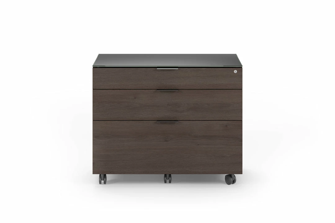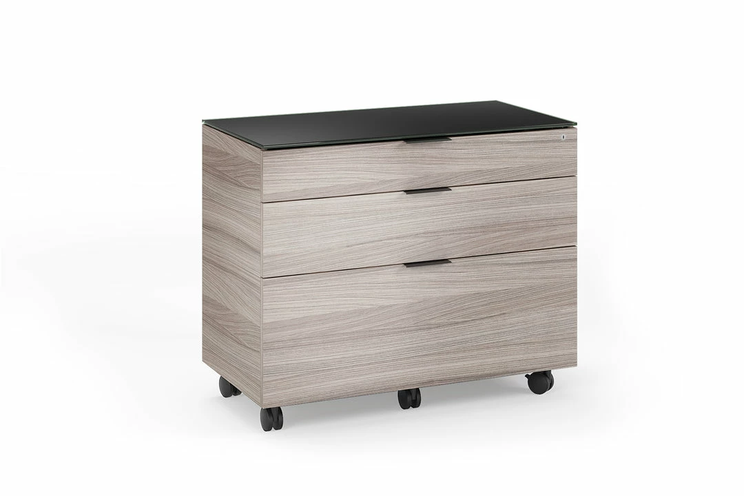 Lateral filing cabinet that includes three locking drawers with a plethora amount of file and accessory storage. This flexible storage system provides soft-close drawers, locking swivel casters, and a highly durable satin-etched glass work surface.