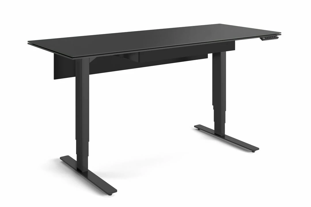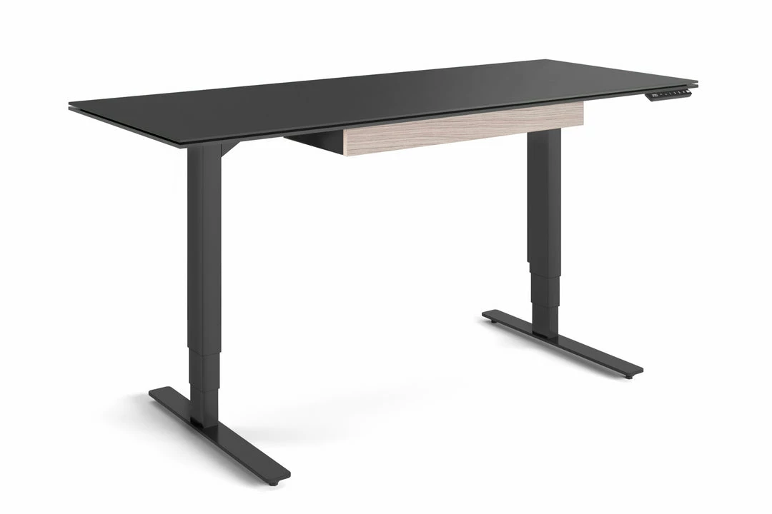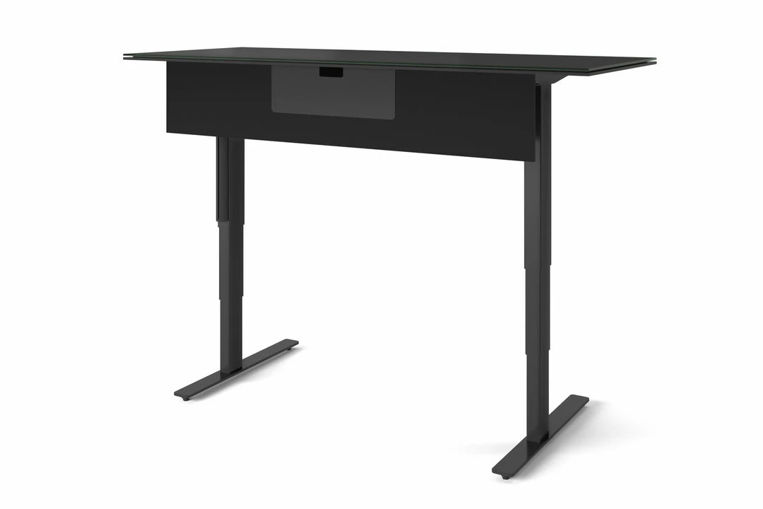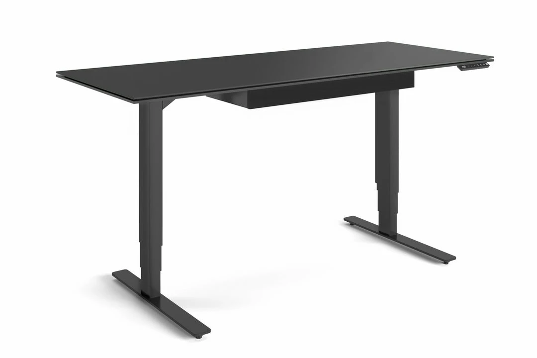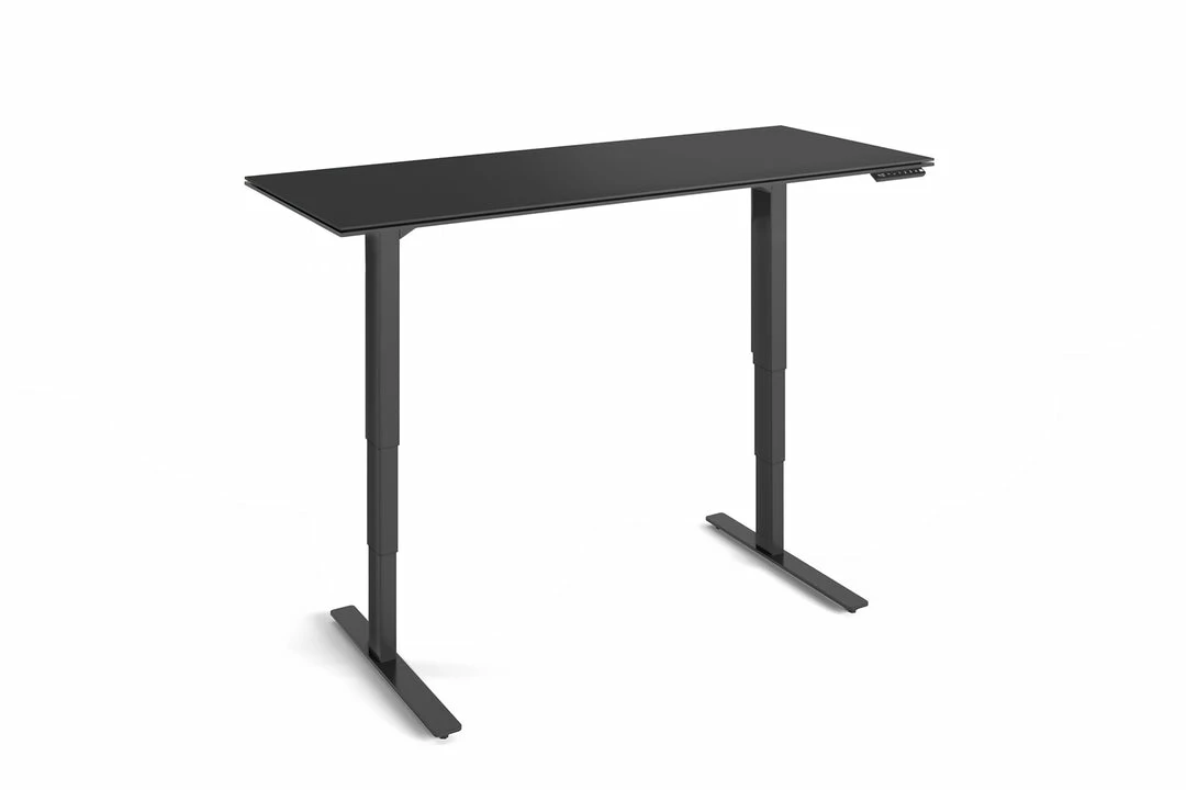 A modern standing desk that features programmable height settings and an elegantly smooth satin-etched glass work surface.