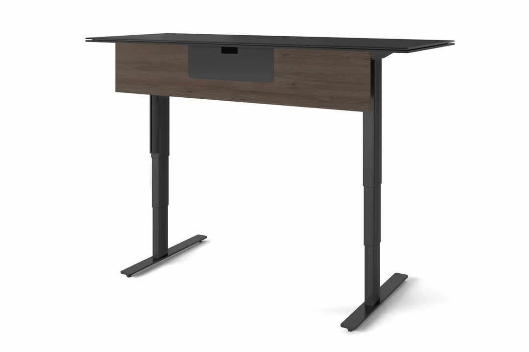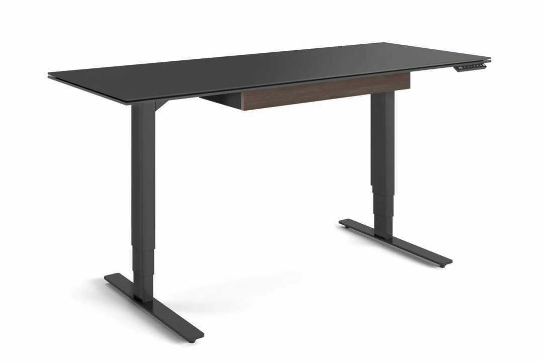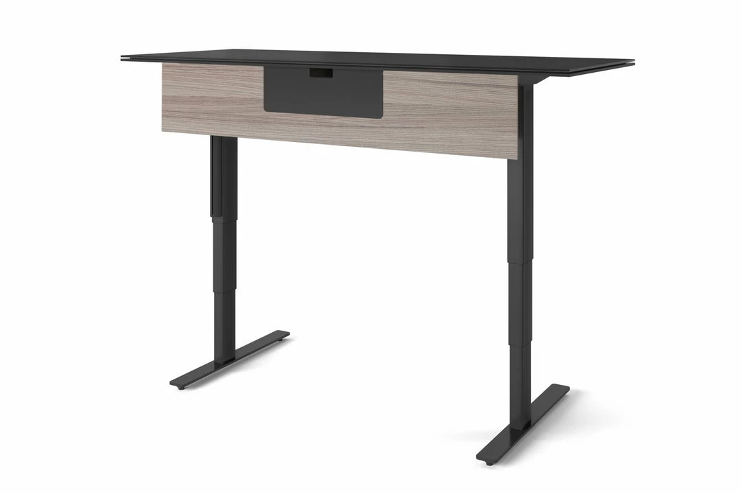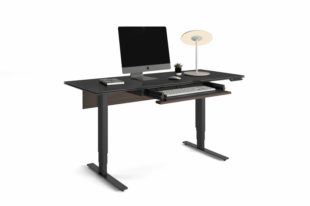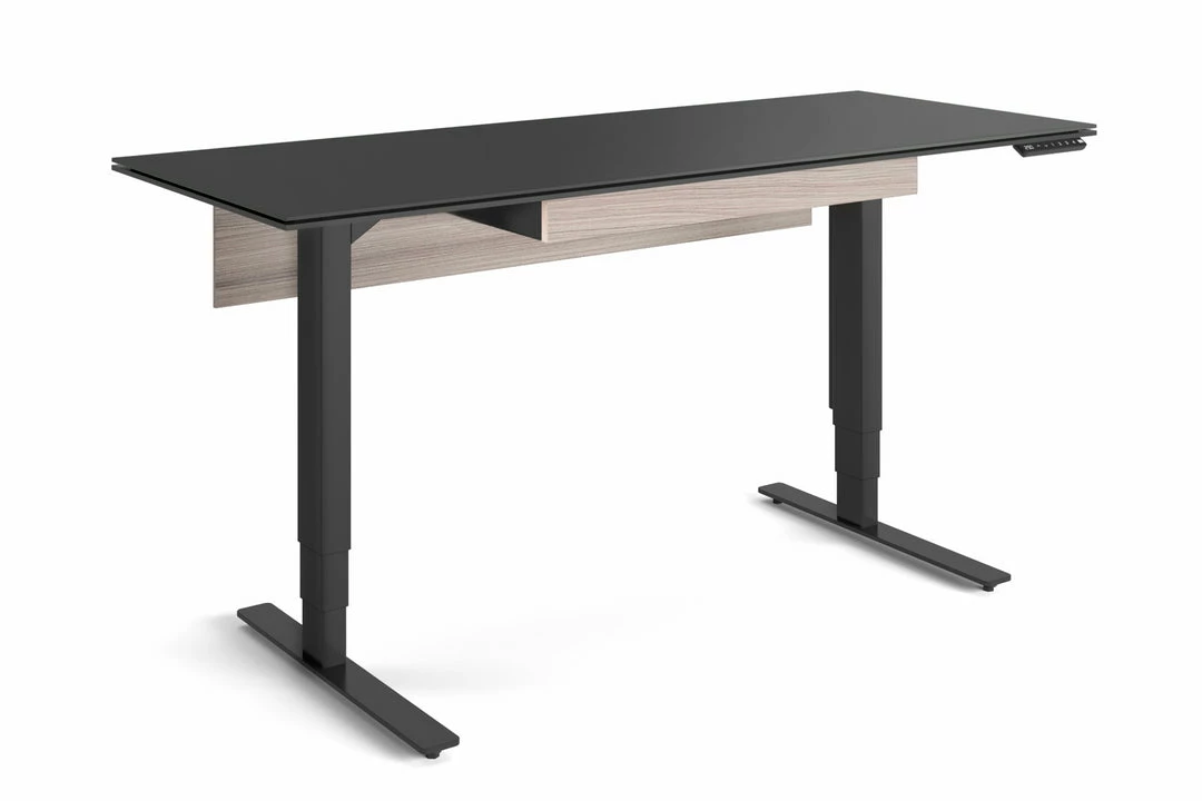 A modern standing desk that features programmable height settings and an elegantly smooth satin-etched glass work surface.