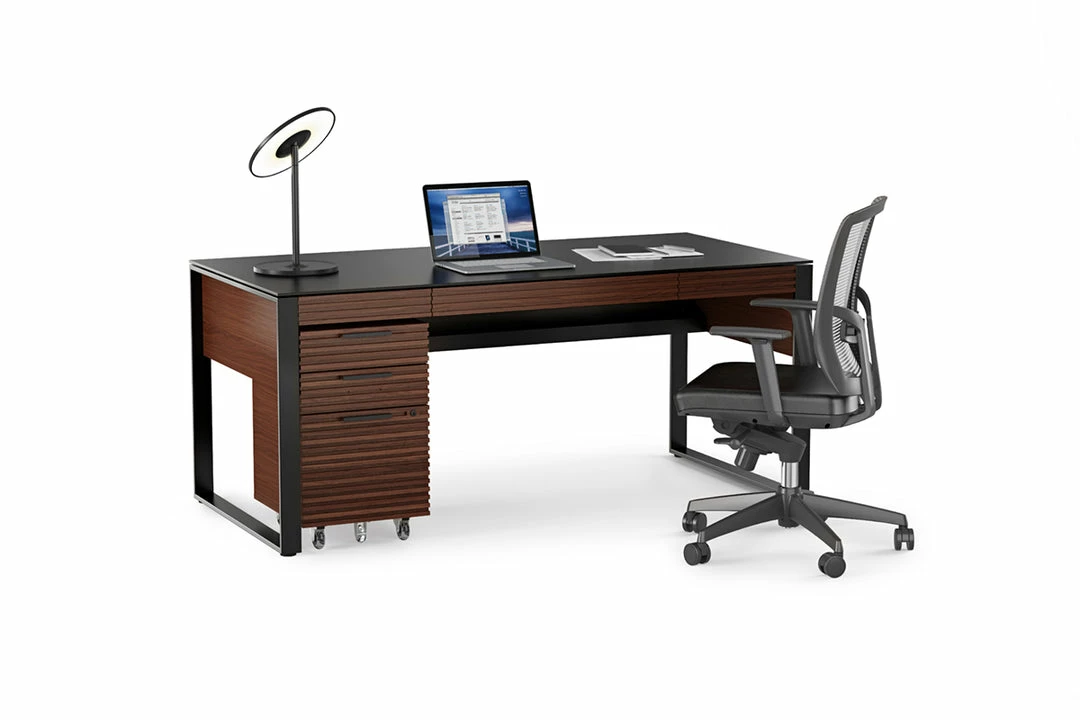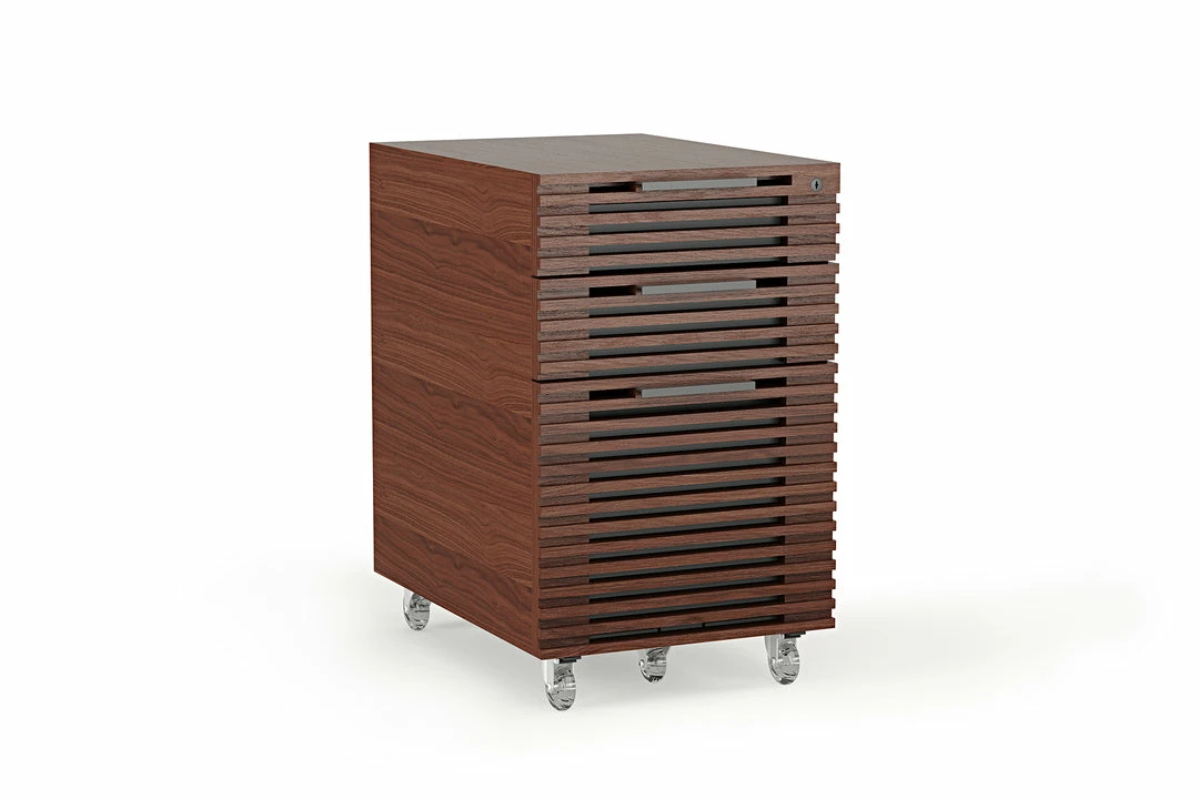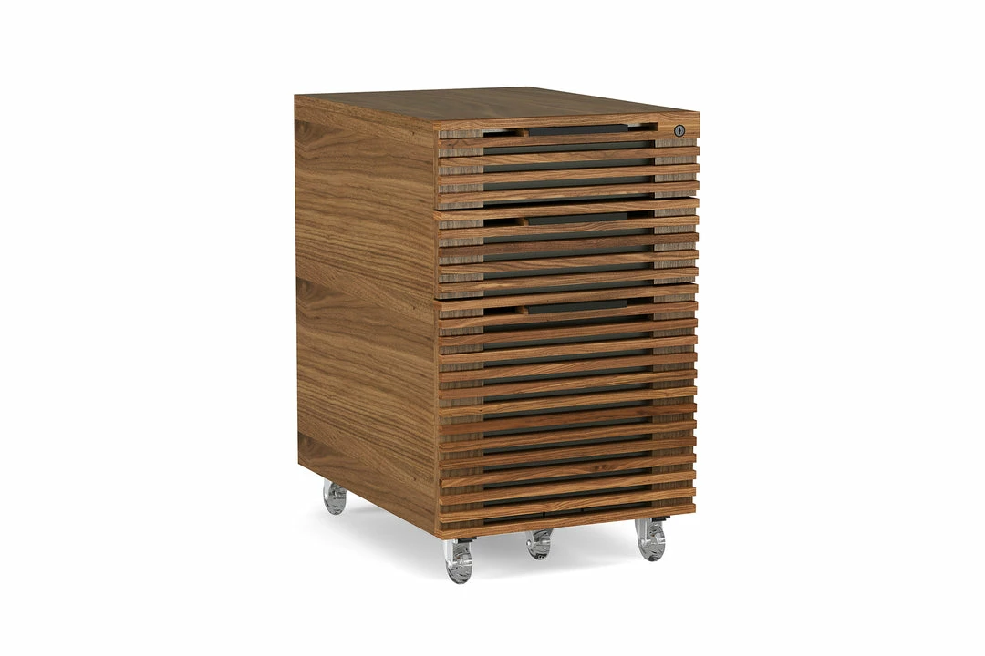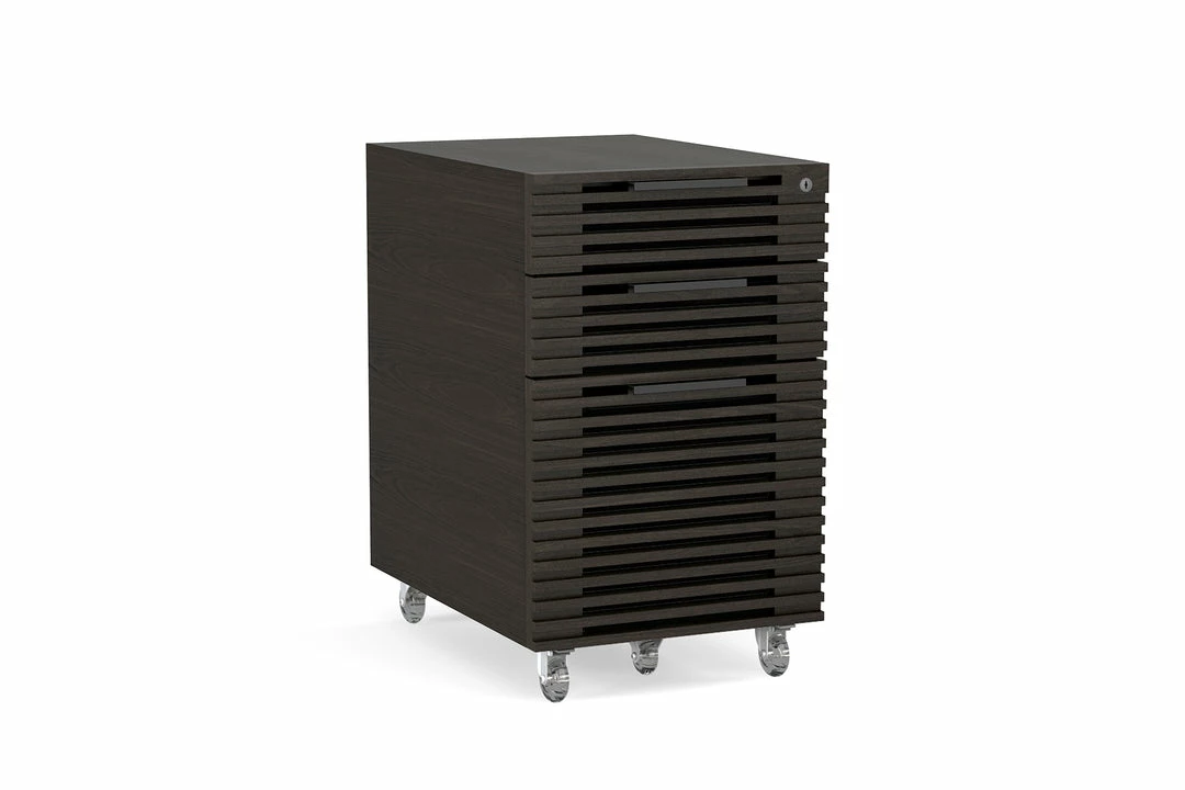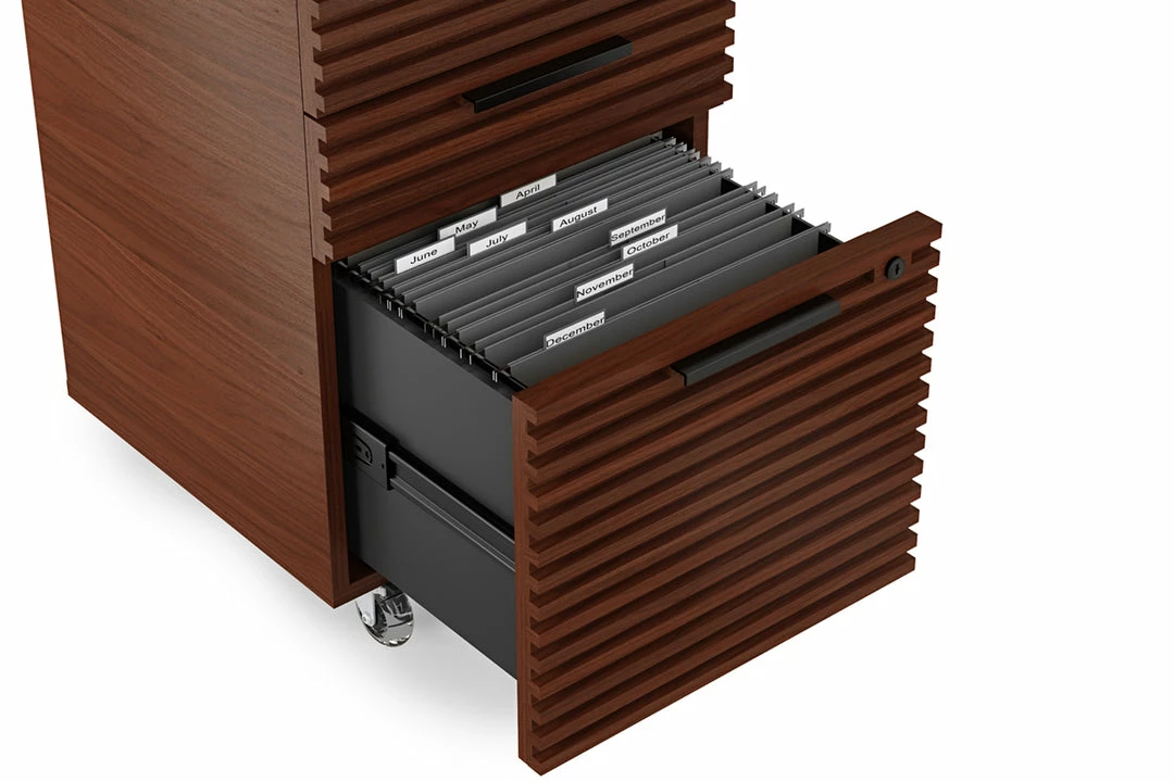 A three drawer, mobile filing cabinet with two storage drawers and one file drawer all secured by one lock. The Corridor Mobile File, with locking wheels, fits perfectly under the Corridor Desk making supplies and paperwork easily accessible.