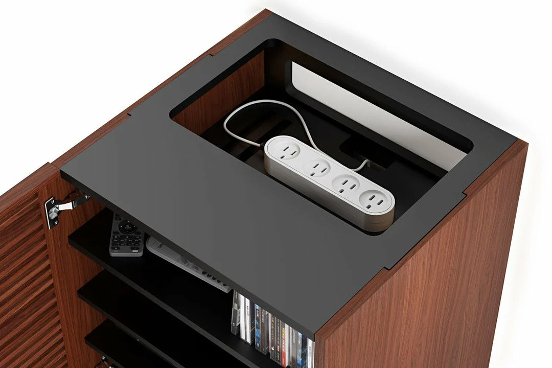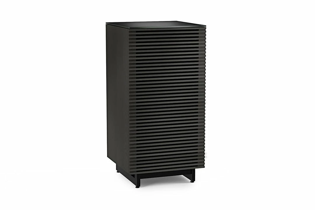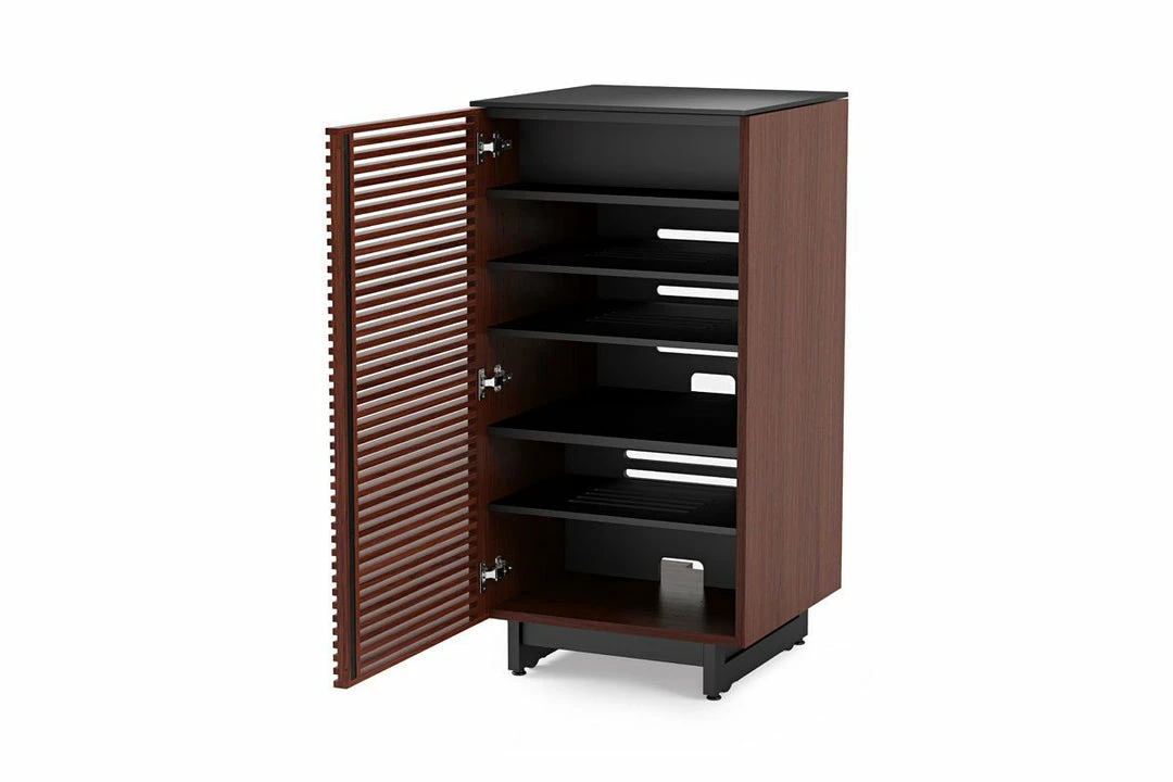 The Corridor audio tower is a sophisticated way to house all of your analog or digital audio needs! The striking Corridor collection features louvered doors of solid wood and a black, micro-etched glass top. The four media cabinets are the ideal home for a flat panel TV and a sound-bar while the bar is an elegant solution for a complete bar in a compact space.
