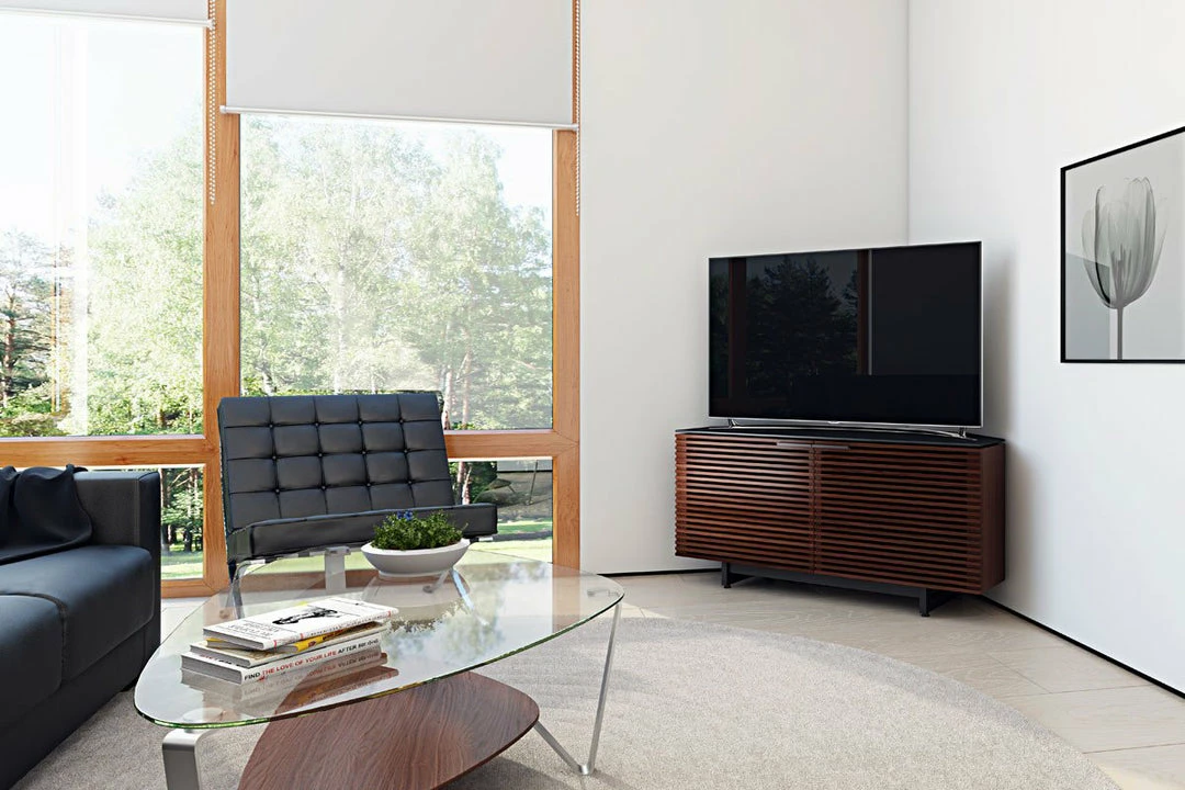 The Corridor cabinet features louvered doors of solid walnut that allow a speaker’s sound or a remote control’s signal to pass through unobstructed. The two center doors open to reveal a large compartment with an adjustable shelf, allowing Corridor to accommodate a wide range of speakers or components. The cabinet features a black, micro-etched glass top and black steel legs. Optional concealed wheels are included.