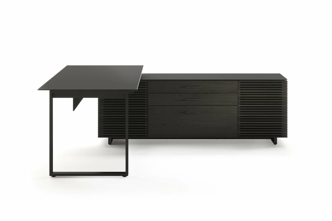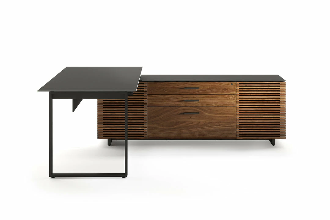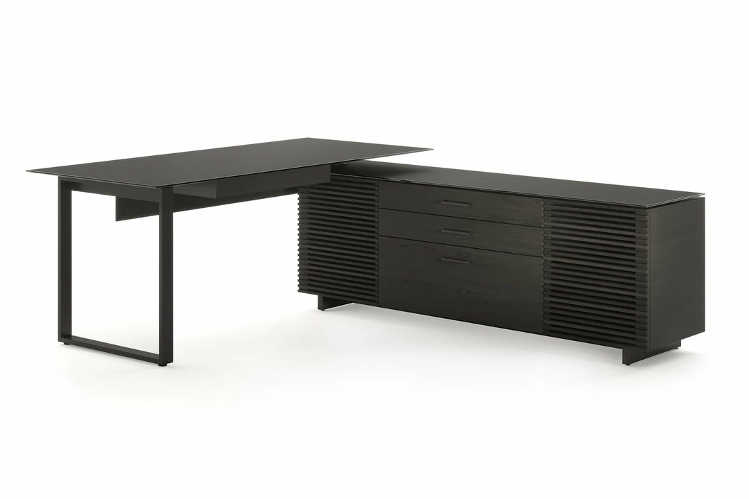 This stunning L-shaped executive desk provides plenty of workspace and storage, whether placed in a corner or commanding the center of your home office. With its space-saving design, ample file storage, reversible and expandable printer tray/compartment, and other user-friendly features, the Corridor L-Desk is an ideal all-in-one office solution.