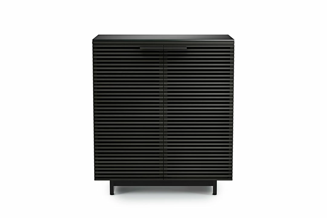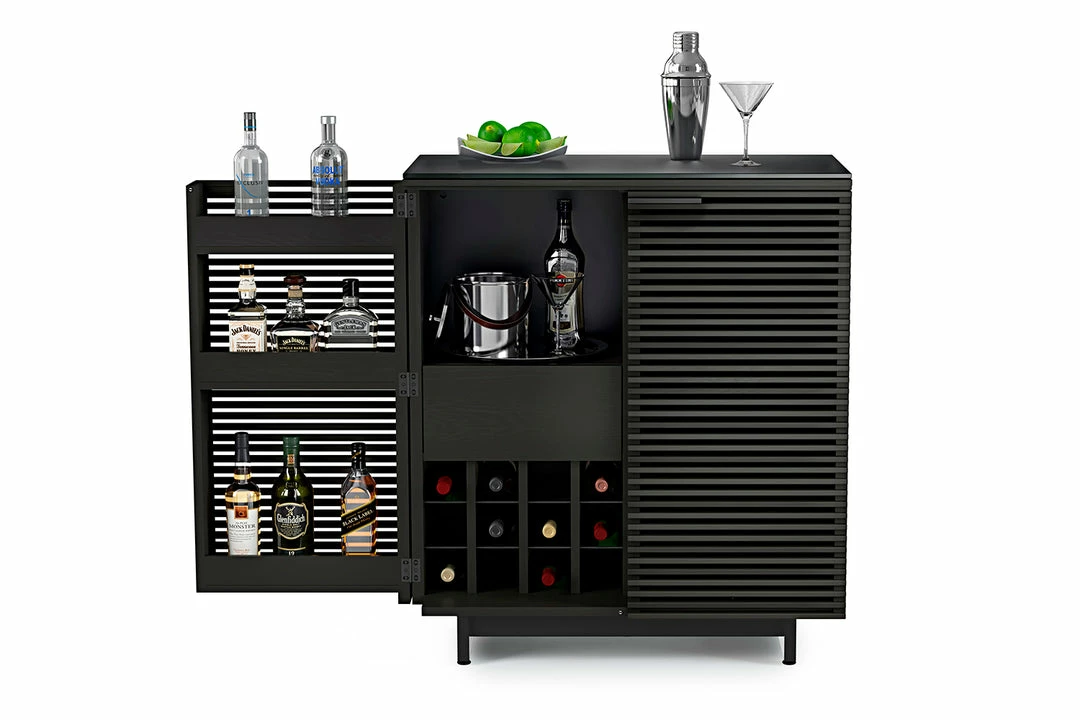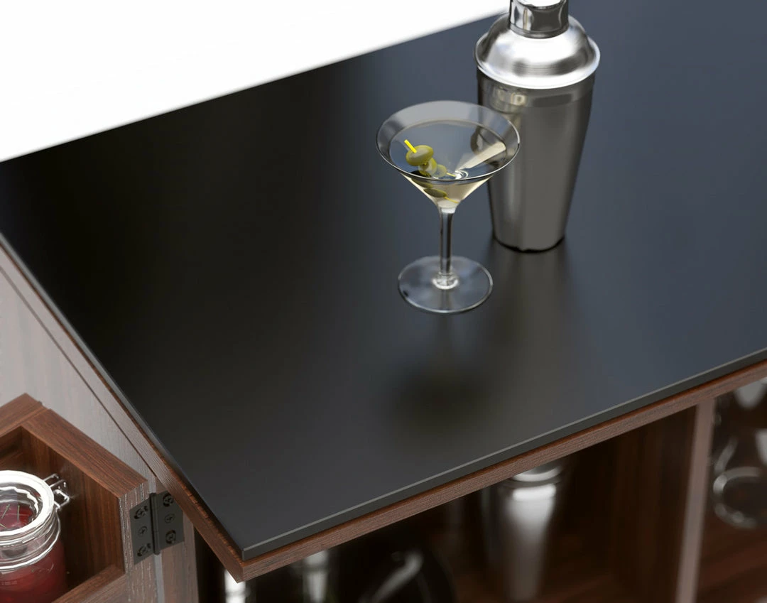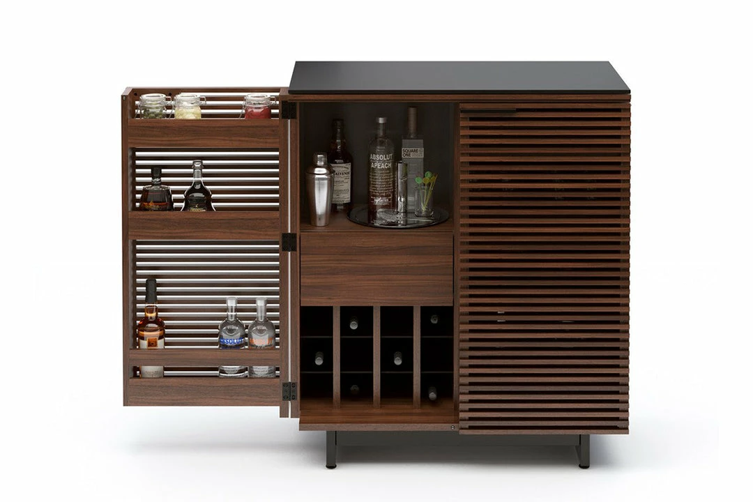 The perfect cocktail of style and function with double louvered doors that open fully, providing easy access to everything that a stocked bar needs. The cabinet offers racking space for wine bottles and storage for a host of liquor bottles on shelves and doors. A wooden stemware rack keeps wine glasses within easy reach and other shelves provide storage for glasses, tumblers and other supplies.