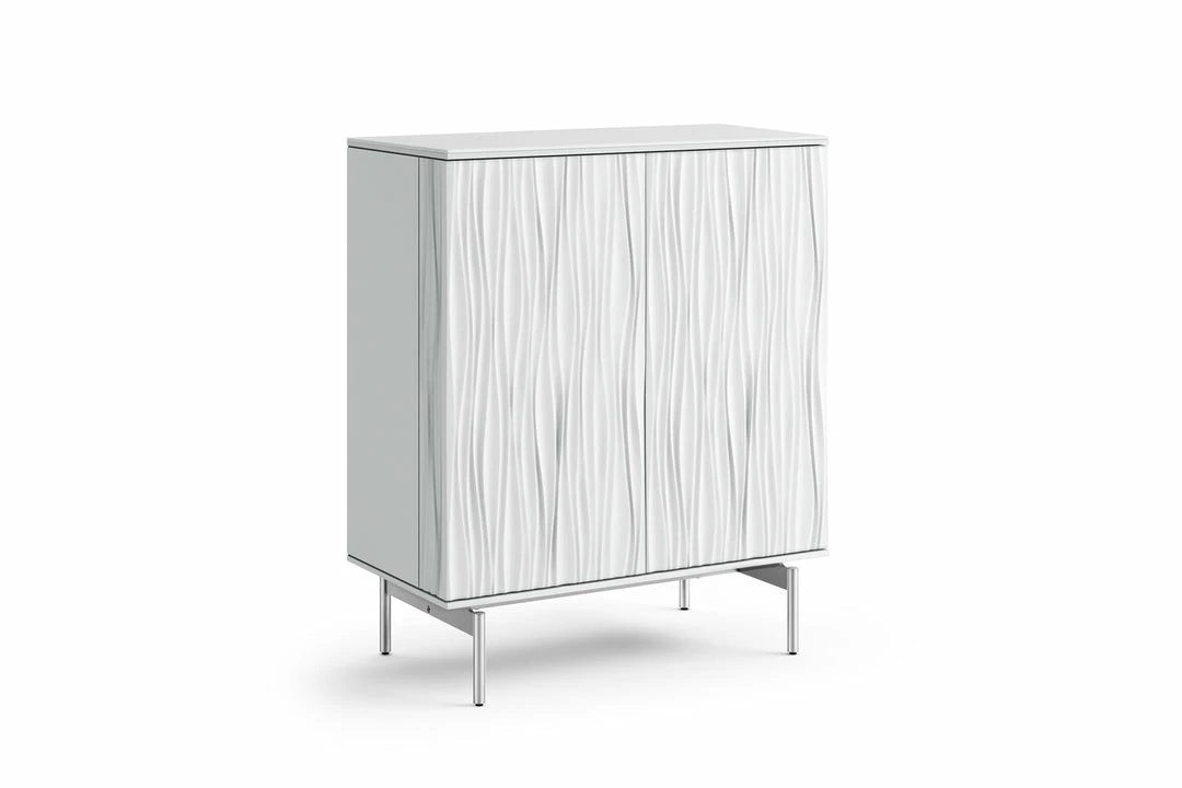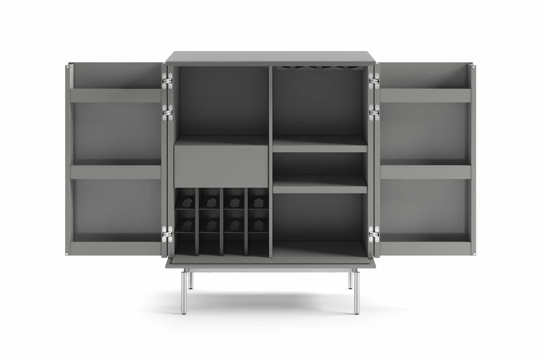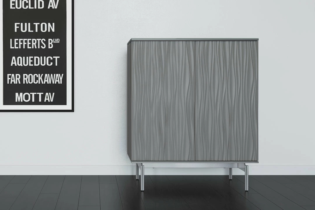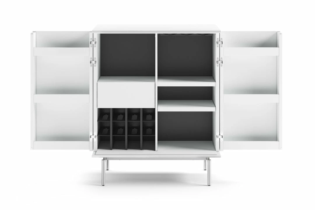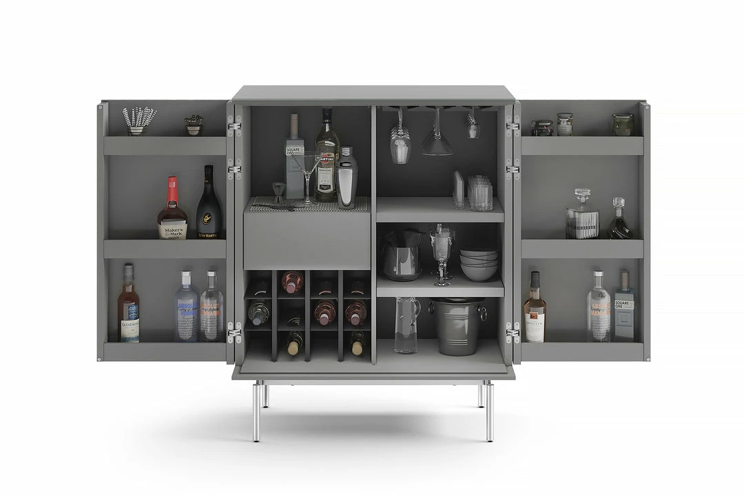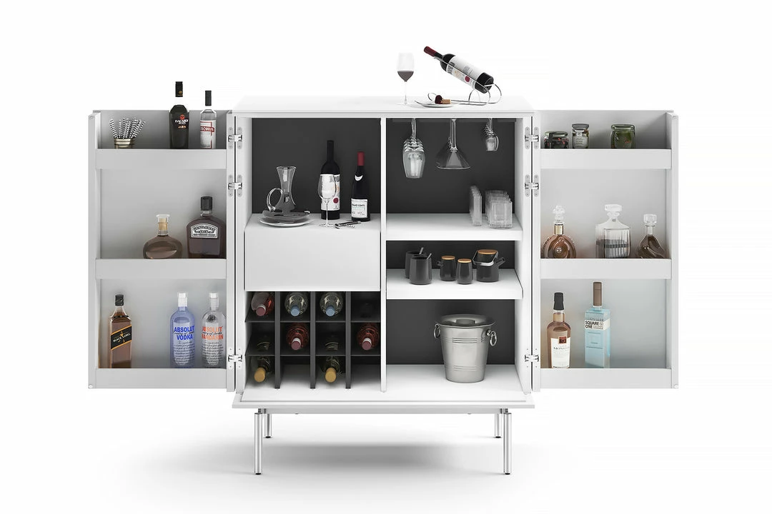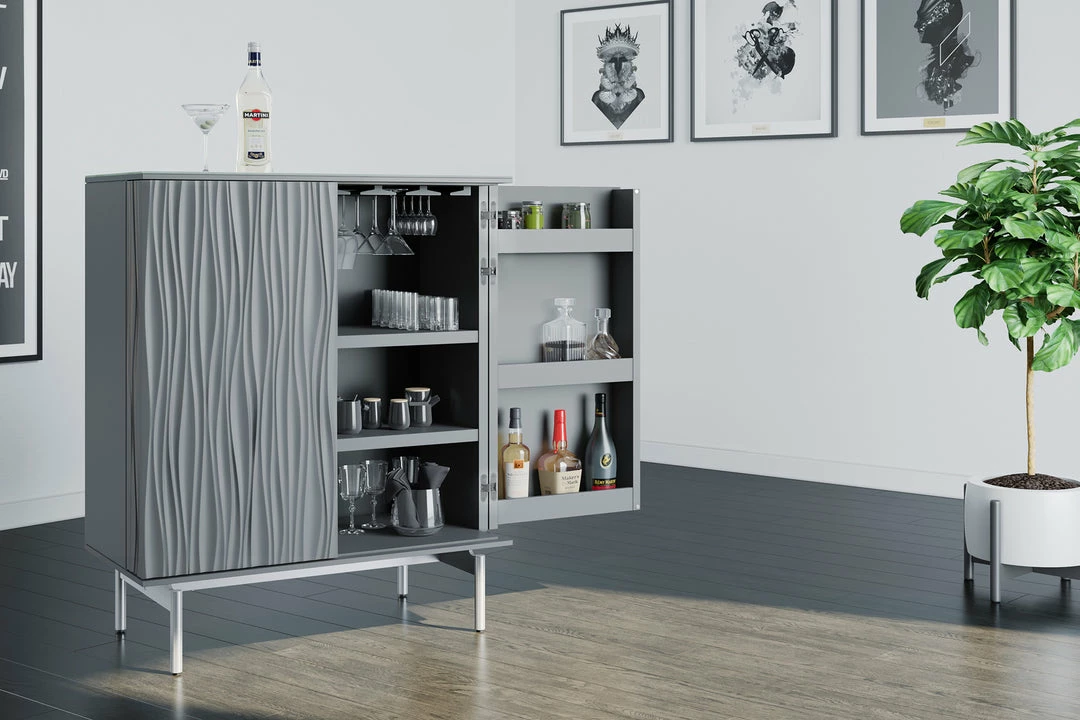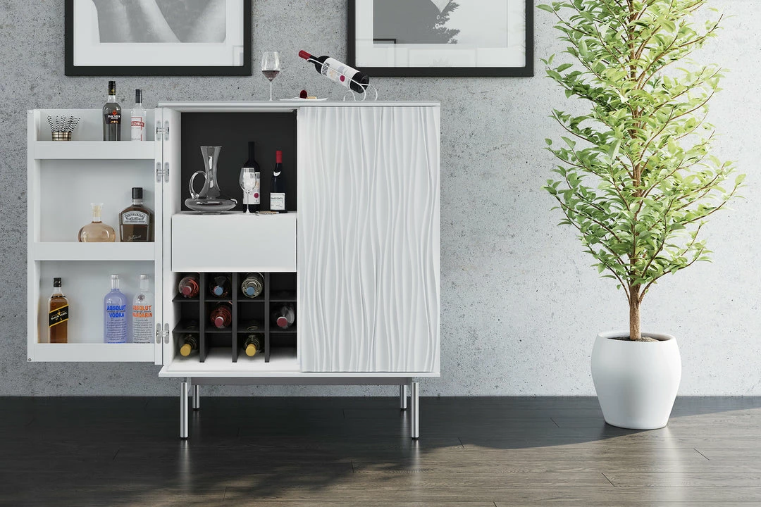 Make some waves with the Tanami Bar. Behind the fluid design of its sculpted doors is ample storage for everything a fully stocked bar cabinet needs. Tanami accommodates everything a fully stocked bar needs—from an assortment of wine and liquor bottles to glassware and other bar essentials—and closes up neatly when the party comes to an end. A fabric-lined wooden stemware rack protects and organizes glassware while helping to minimize vibration.