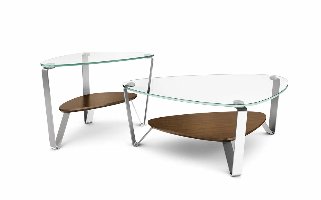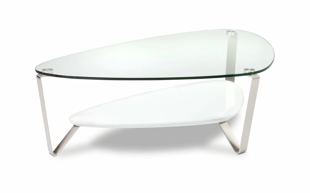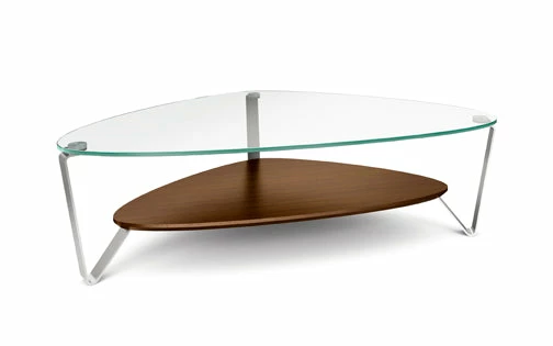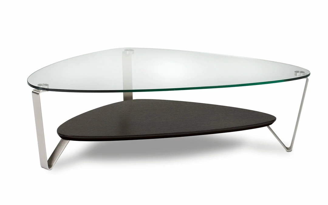 The versatile, soft triangular shape of the Dino coffee tastes able makes it a great choice for a variety of settings. The polished tempered glass top is supported by steel legs with a beveled lower shelf.