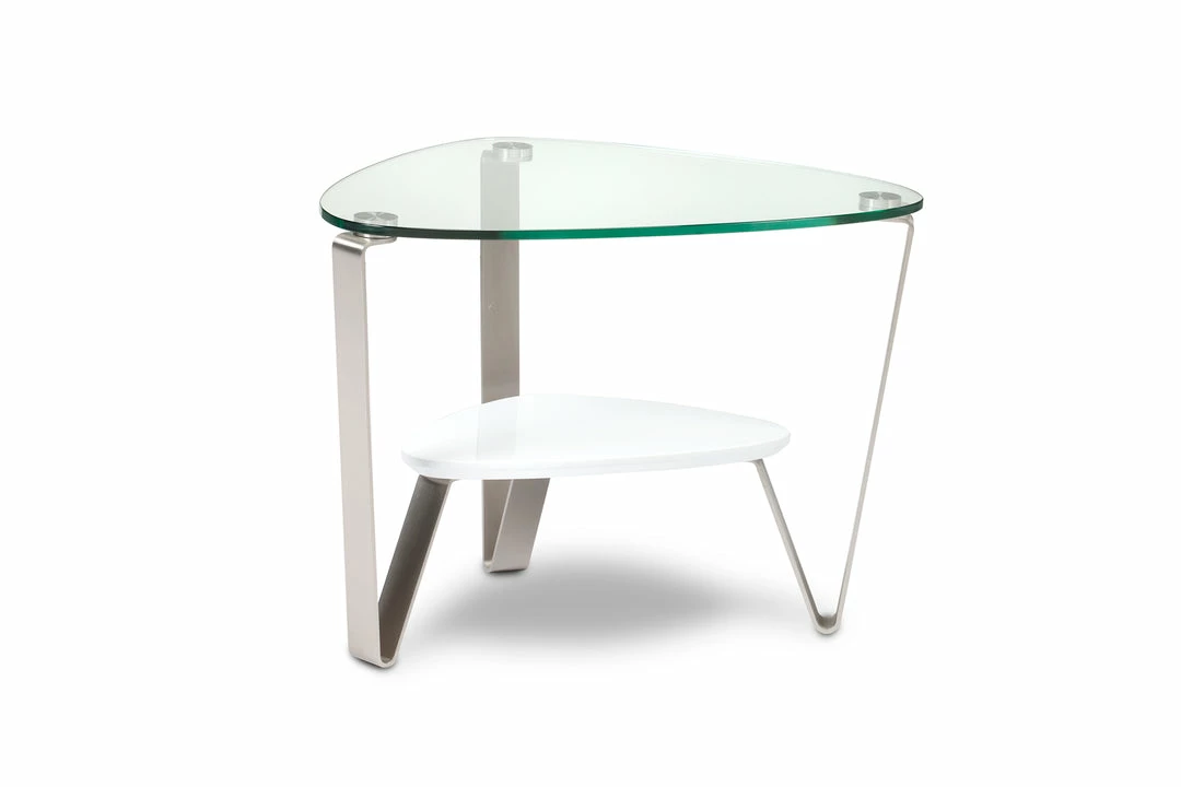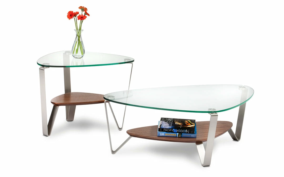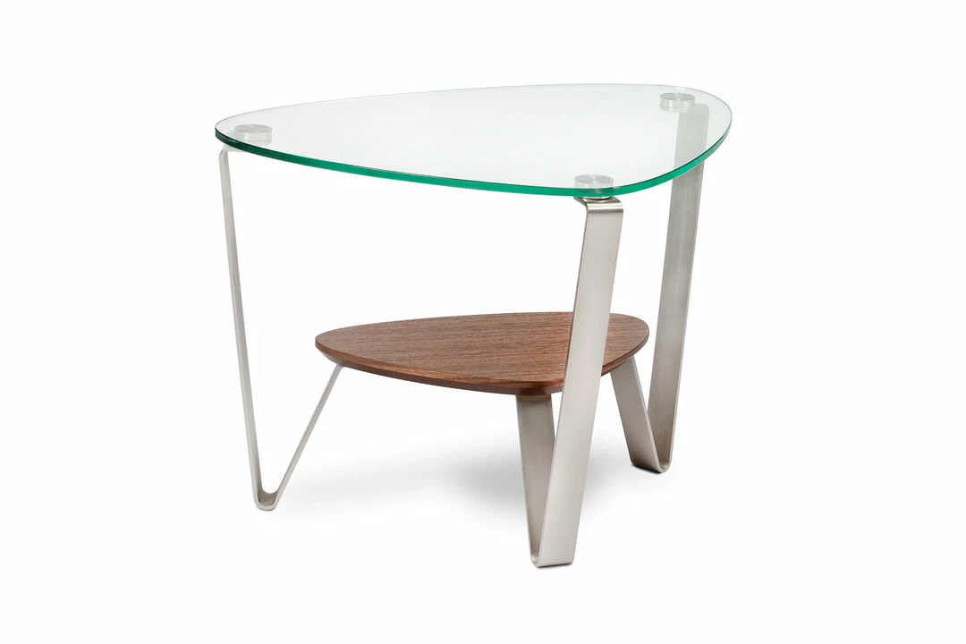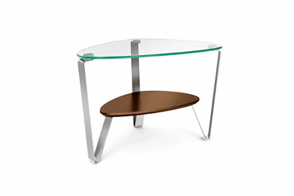 The versatile, soft triangular shape of the Dino collection makes it a great choice for a variety of settings. The polished tempered glass top is supported by steel legs with a beveled lower shelf.