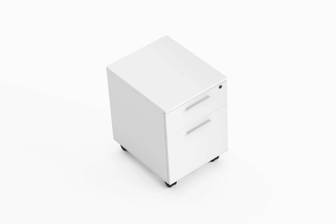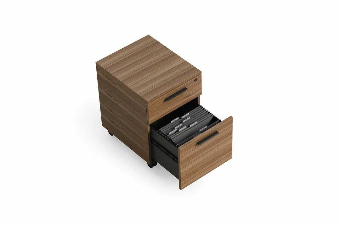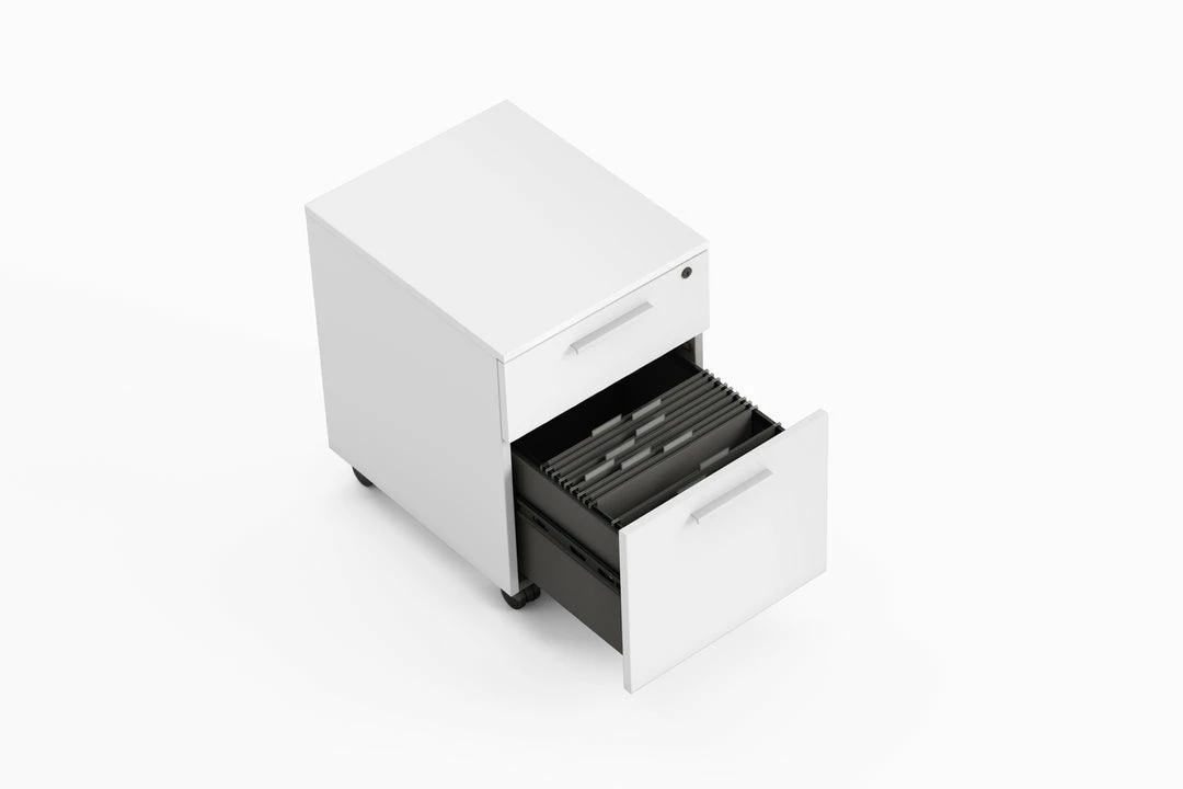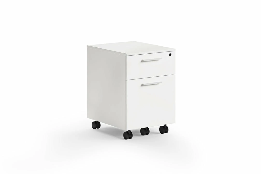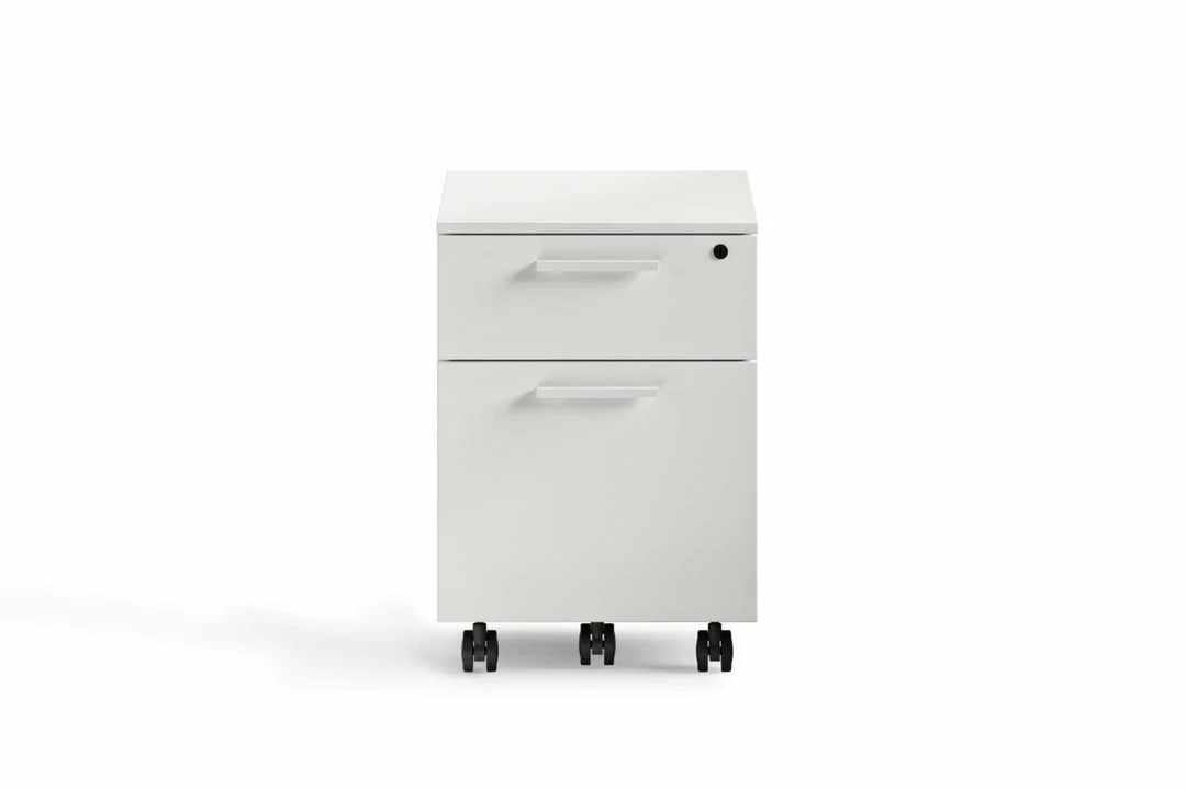 The Linea Mobile File Pedestal features locking wheels, a letter/legal-sized file drawer, and a top supply drawer. Perfect under a Linea desk or used as a mobile printer stand.