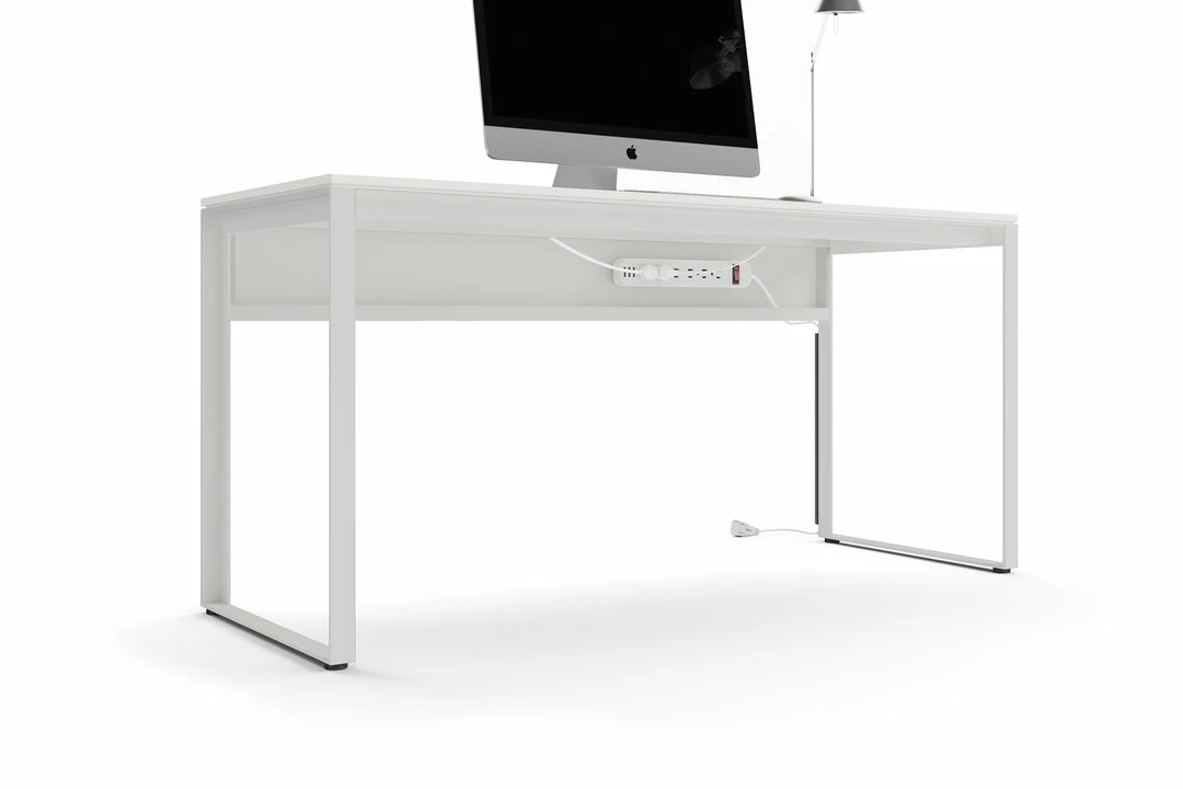 A reversible wire management trough can be mounted to face the front or back of the desk and includes a power strip mounting kit. Power strip not included.