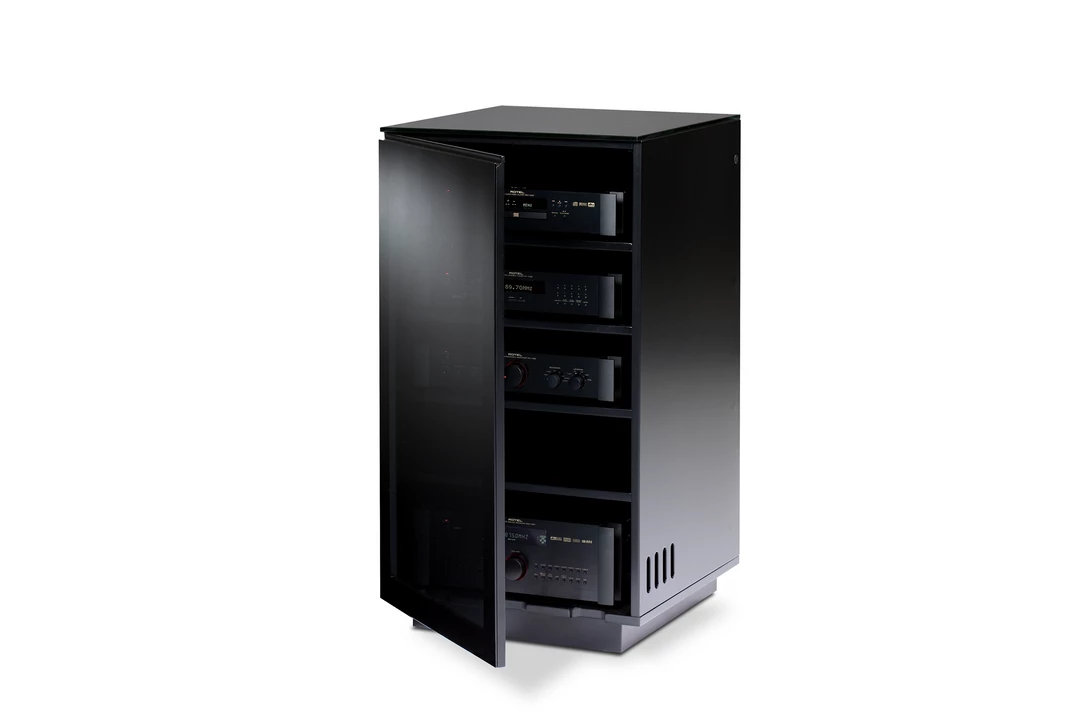 Unleash your inner audiophile and store a host of gear inside this full-featured audio tower + stereo cabinet with a remote-friendly and reversible tinted glass door. The IR-friendly glass door can be positioned to open from the left or right—ensuring you always have access to your gear. Generous ventilation slots in the sides, shelves, and back panels allow air to freely circulate.