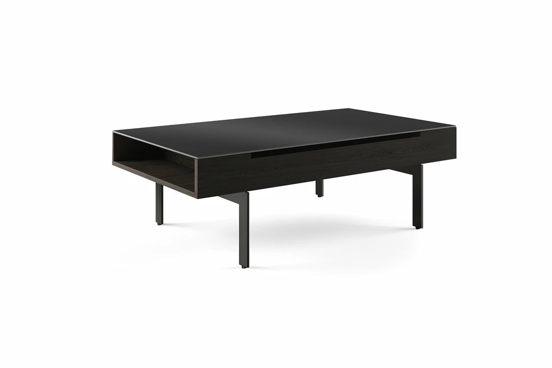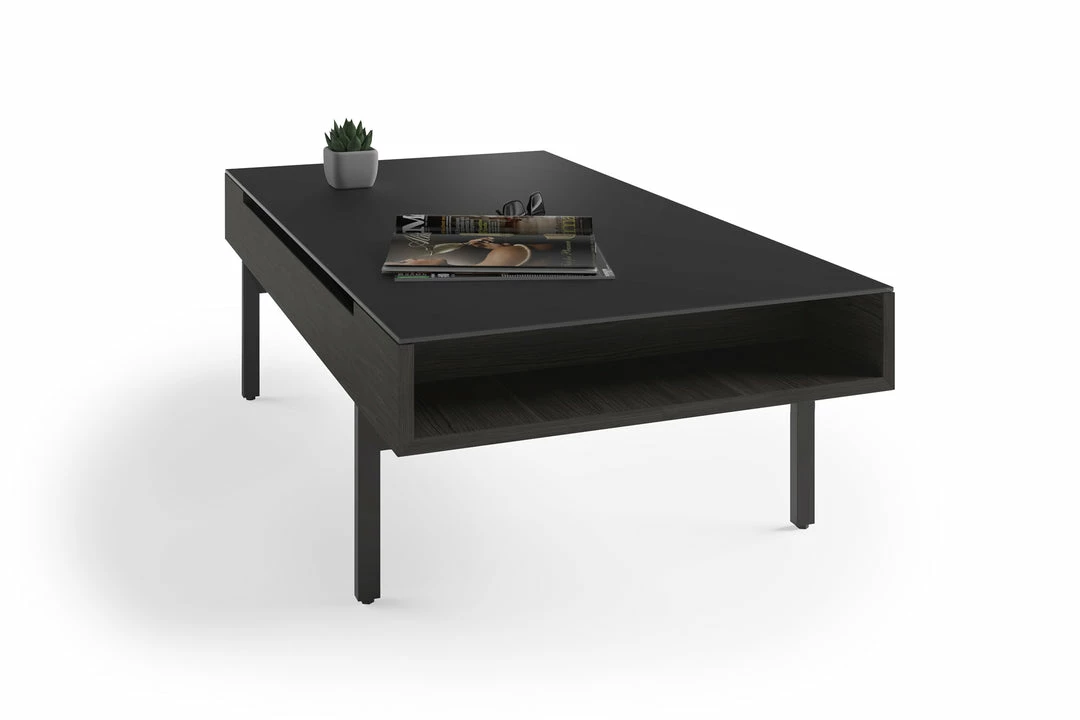 The durable—yet incredibly soft-to-the-touch—satin-etched glass top surface is forgiving of fingerprints and daily use, concealing a larger storage compartment contained underneath when closed.