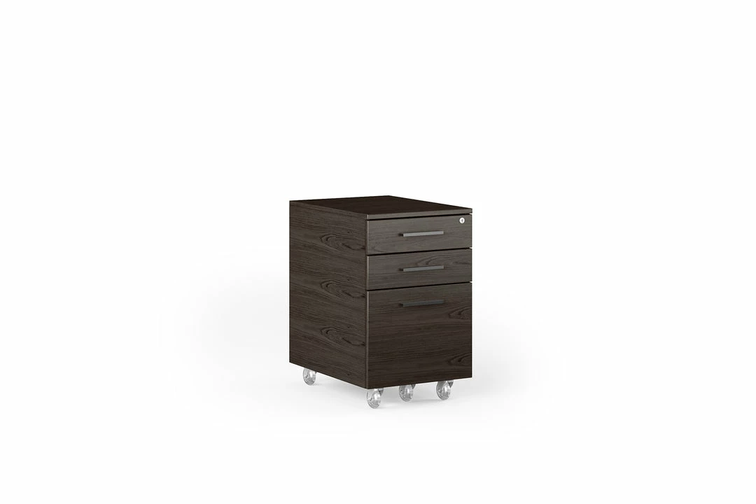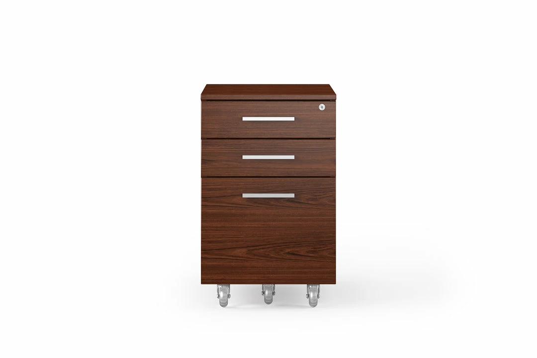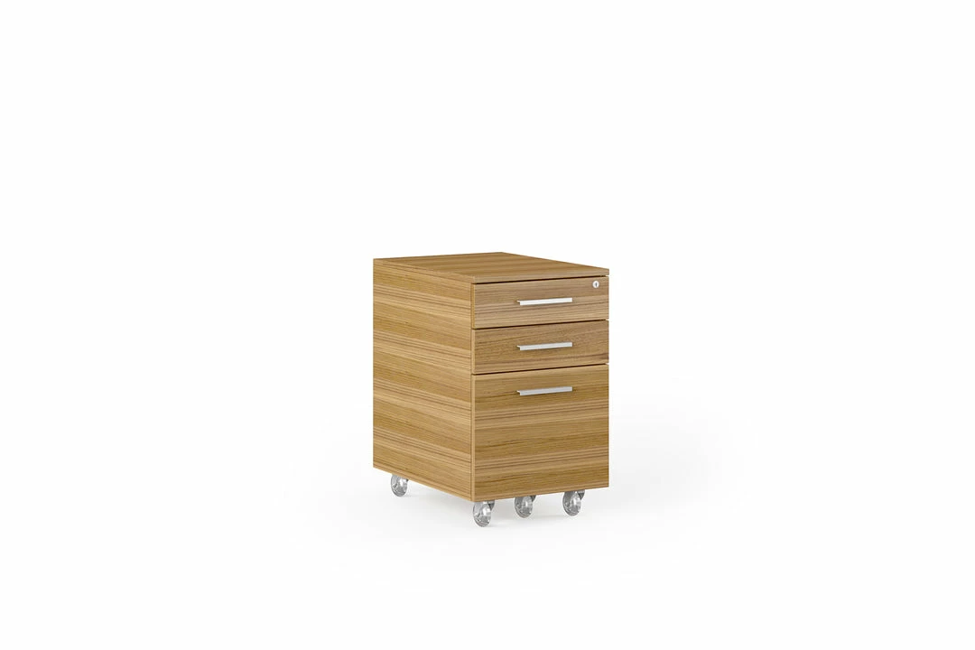 Low mobile file cabinet with locking wheels, a letter/legal sized file drawer and two supply drawers. Designed to fit neatly under the Sequel Desk, it also makes a great compact printer stand. An integrated lock secures multiple drawers with a single key; replacement locking cylinders are available, if needed.