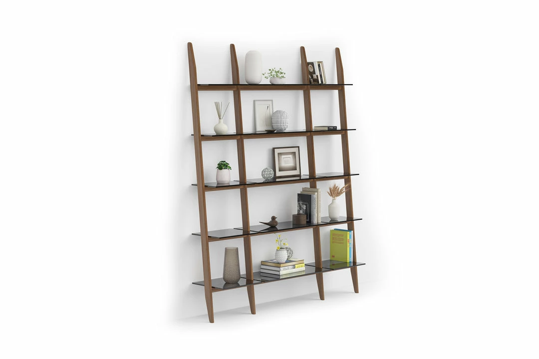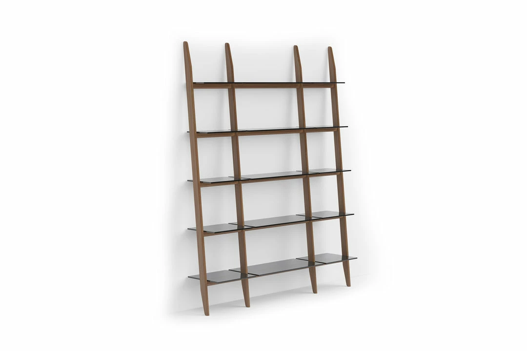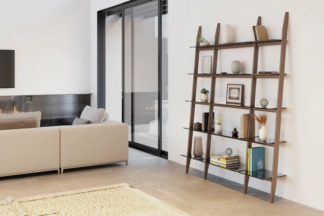 Grey-tinted tempered glass shelves are secured to the frame, recessing as the slope ascends, providing ample storage and display space for books and a lifetime of treasures.