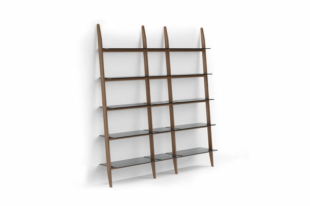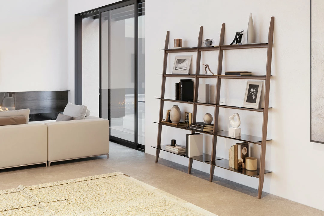 Grey-tinted tempered glass shelves are secured to the frame, recessing as the slope ascends, providing ample storage and display space for books and a lifetime of treasures.