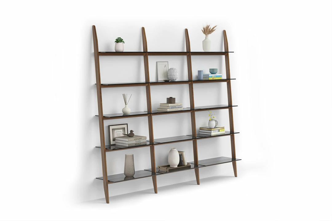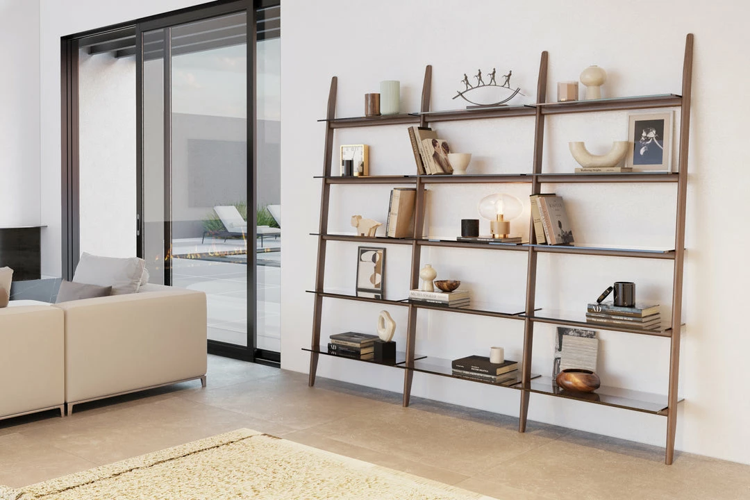 Grey-tinted tempered glass shelves are secured to the frame, recessing as the slope ascends, providing ample storage and display space for books and a lifetime of treasures.