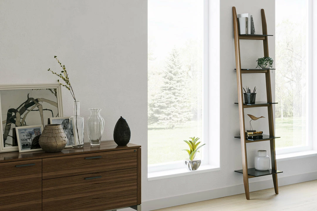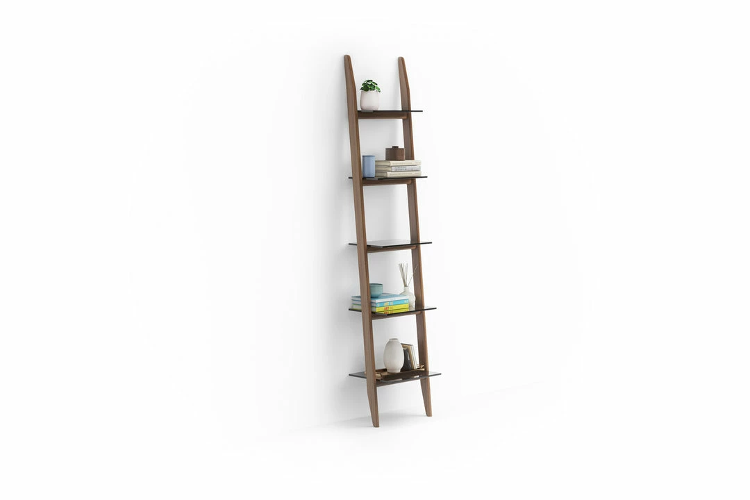 A narrow single ladder shelf that makes excellent use of vertical space with sleek grey glass shelves for open storage and display, perfect for tight or limited spaces where extra storage is needed.