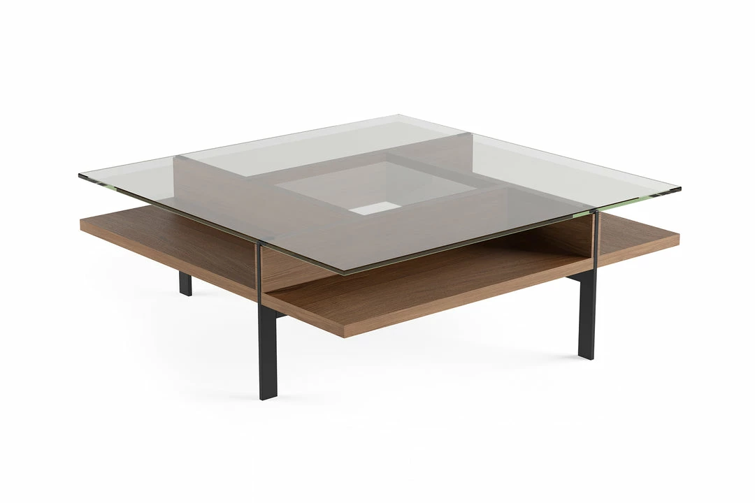 Terrace is a beautifully functional table grouping. Combining tempered glass tops, open display storage, and thick panels on steel supports, the collection includes two coffee tables sizes, in addition to a matching end table and console. The unique pinwheel design of this coffee table offers open—yet compartmentalized—sections that provide ample display space and item storage.