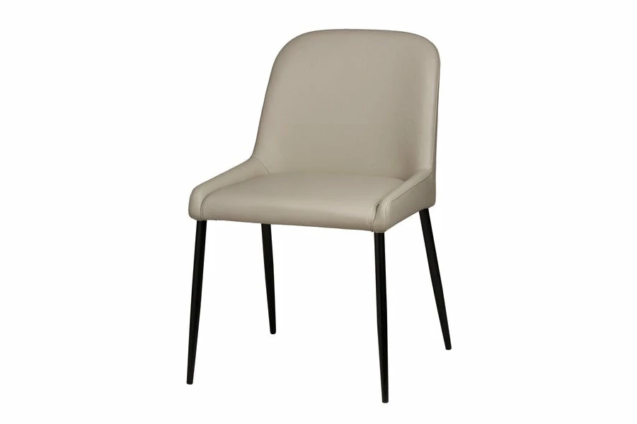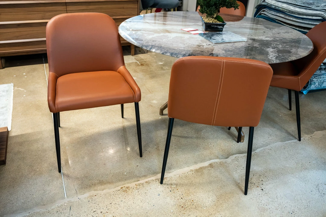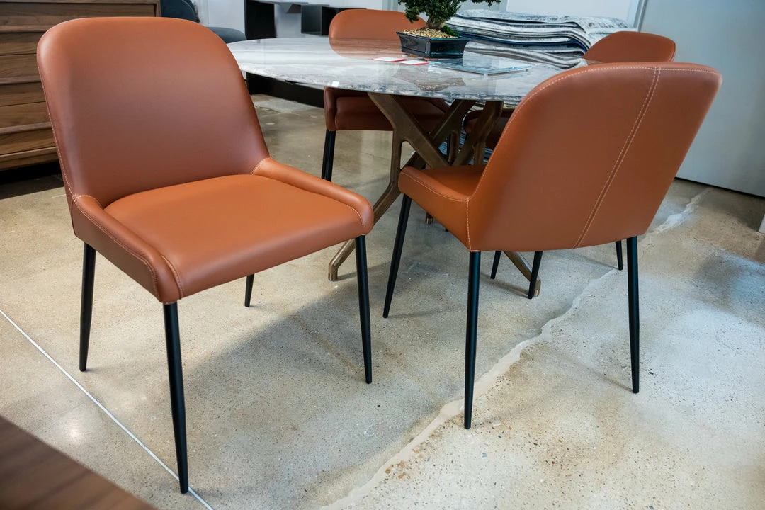 The Julia chair is a modern leather dining chair with a thin black powder coated tapered, metal leg.
