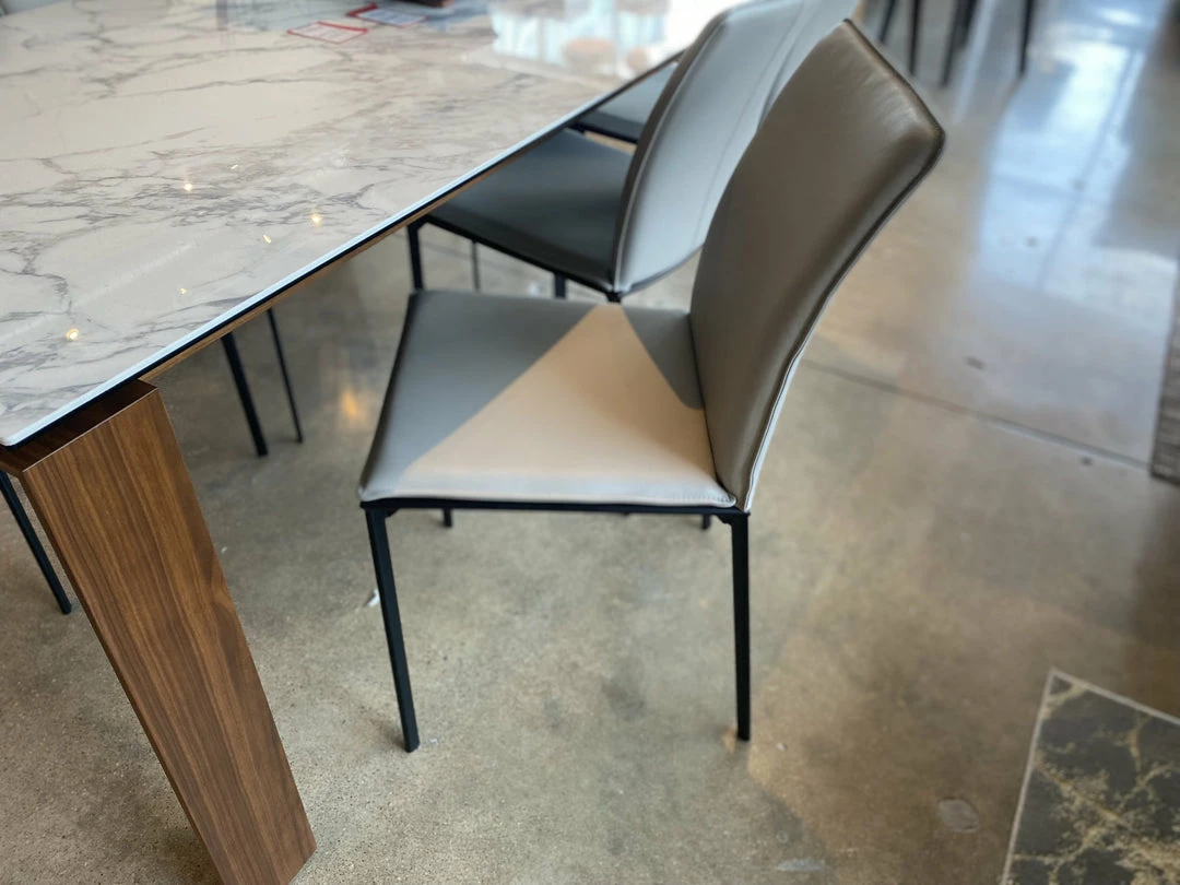 The Olivia chair is a minimalist dream with thin lines outlining an armless frame. Available in Light Grey leather or Cotto leather with black powder coated legs.