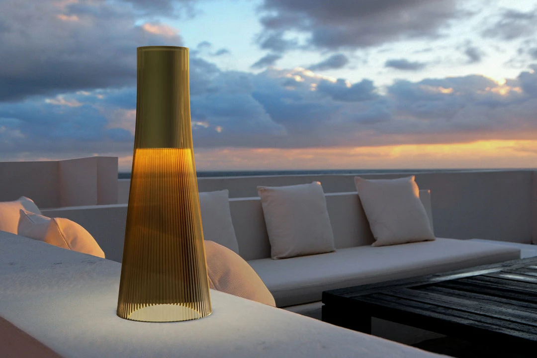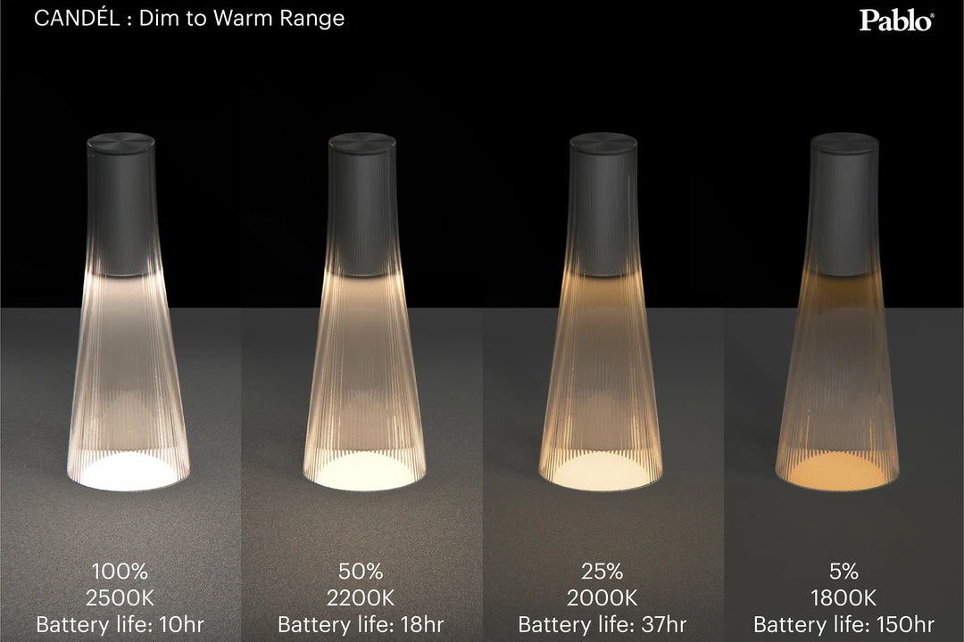 Inspired by a cone of light, Candél’s graceful vessel-like silhouette is in perfect harmony with its surroundings allowing the environment to filter through. Candél casts a warm, intimate candle-like glow that’s sure to seduce and become the central focus of any social gathering. Candél is a fully rechargeable portable LED light designed for both indoors and outdoors. Features a robust PMMA body in Clear or Bronze tint combined with a striking anodized aluminum light module that offers capacitive touch light control to provide up to 4 light levels to set the perfect ambiance. Battery life ranges from 9 to 150 hours depending on light intensity.