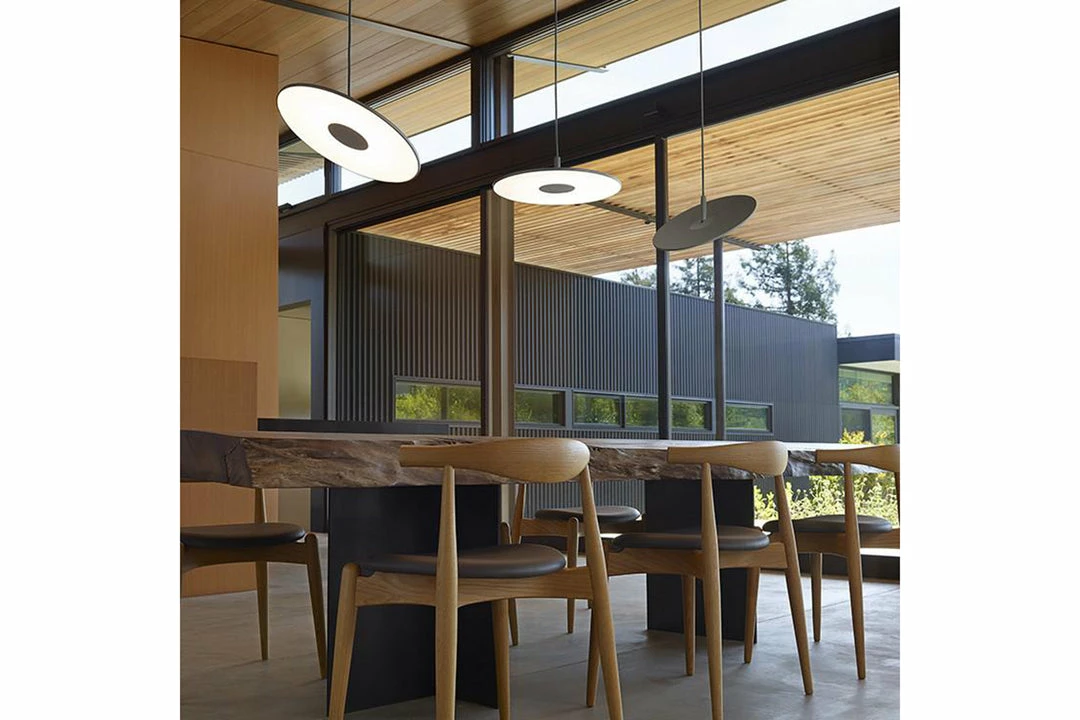 The Circa Pendant presents a LED flat panel disc that can be angled at 45° and is partnered with a 360° rotation feature, allowing for flexible and ambient light. This lighting feature also provides 4 levels of light intensity and an integrated USB port for mobile devices. Available in 2 sizes and finishes.