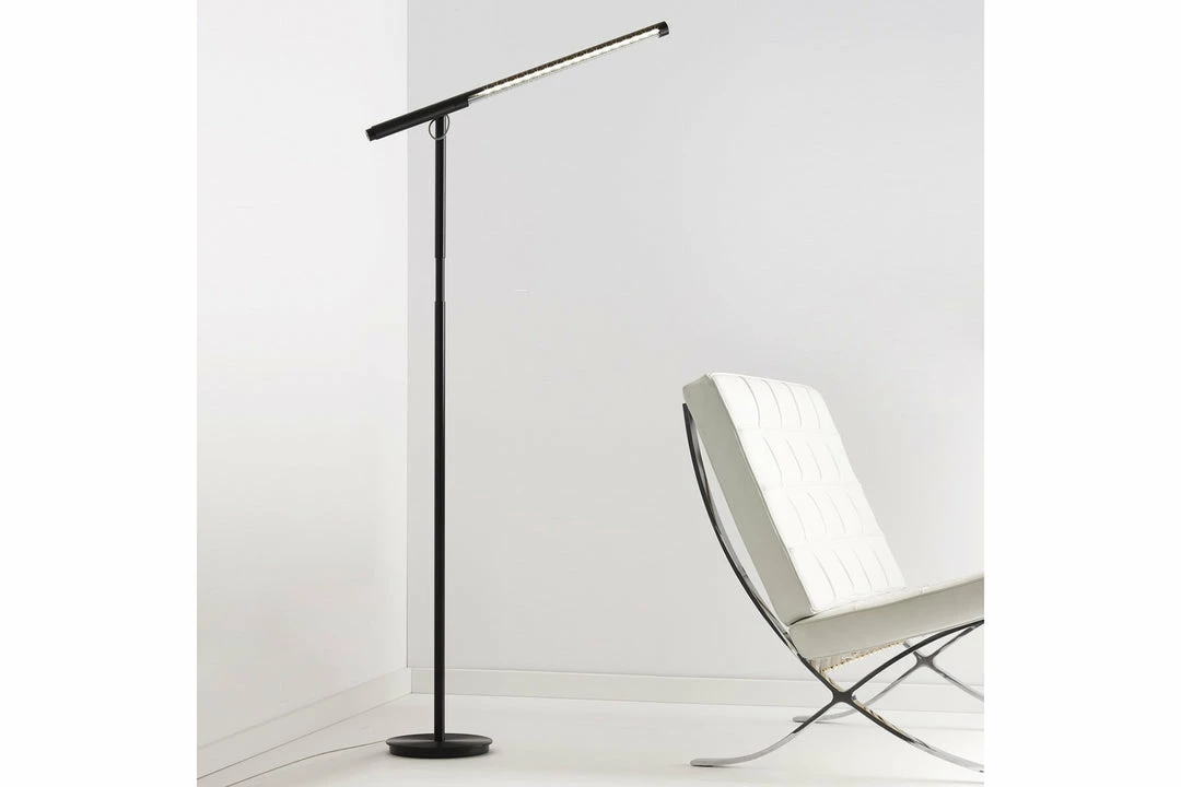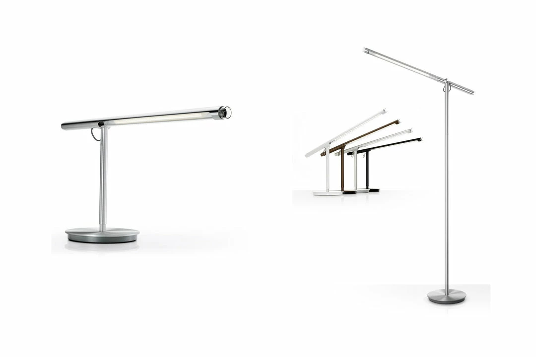 Fusing breakthrough LED technology with a uniquely tactile and calibrated light control experience, Brazo is an intelligent, precise and effortlessly adjustable task lamp. A user can tune it to any beam spread, brightness and direction, controlling the volume and focus of light. The aluminum shade on the lamp’s arm enables much of this adjustability, enabling the user to fluidly dial it around the light source to guide the beam in any direction. Although suitable for any environment, the versatility and 360° adjustability offered in its minimal frame makes Brazo ideal for use in work environments. Brazo transforms from table to floor model with a simple extension arm and ships flat-packed for easy transport.
